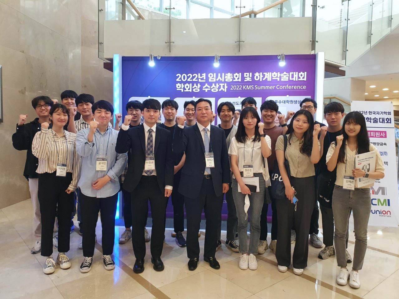 대학원생 이정규, 고한석, 부홍은, 이지영, 정은진이 2022년 5월 25일부터 27일 제주도에서 개최된 한국자기학회 하계학술대회에 참석했다. 한국자기학회장인 김영근 교수는 tutorial session에서 실전 영어과학논문 작성법을 강연했다.
