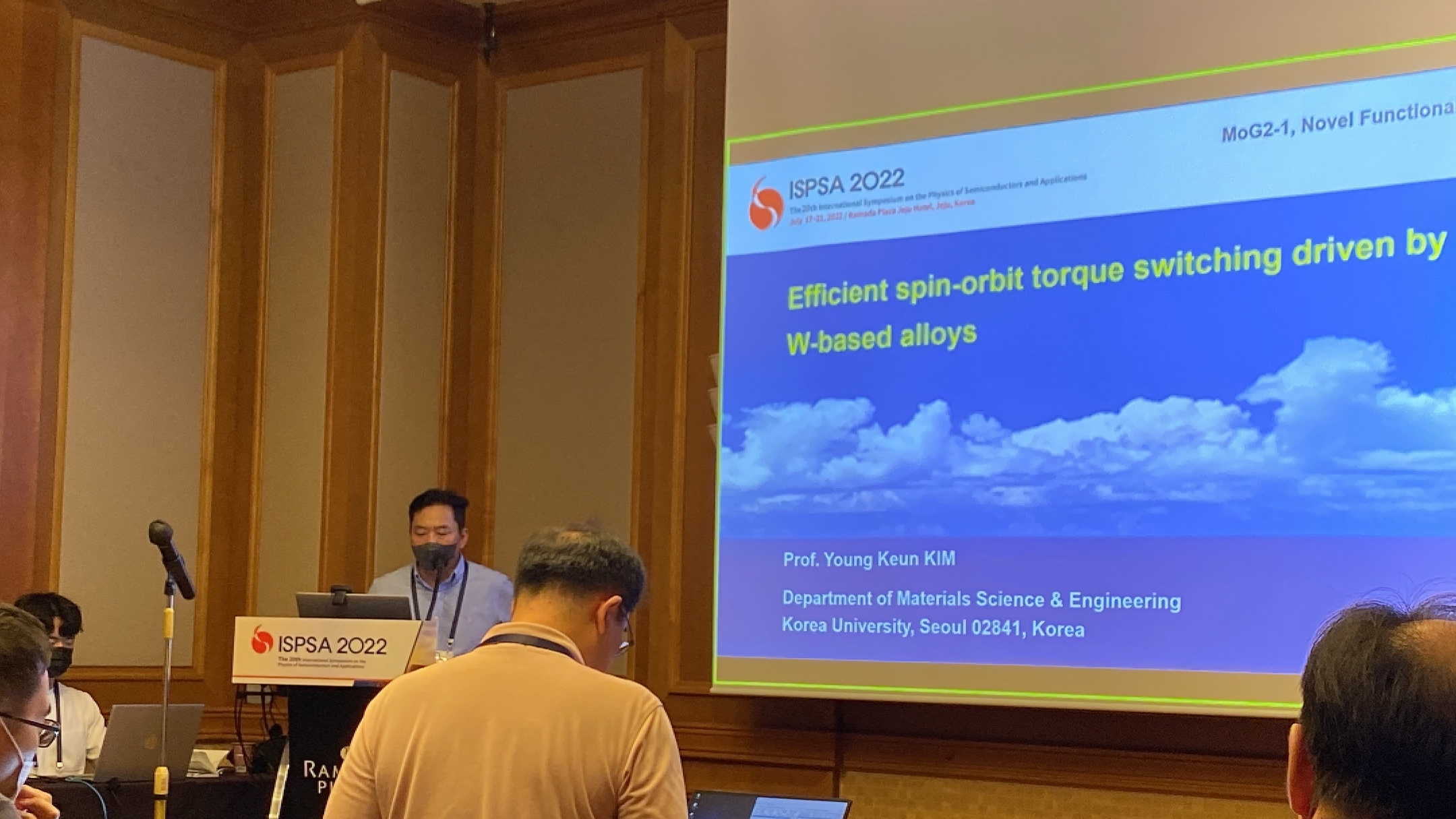 대학원생 문준환, 이정규, 이지영이 2022년 7월 17일부터 21일 제주도에서 개최된 ISPSA(International Symposium on the Physics of Semiconductor and Applications)에 참석했다. 발표자로 초대받은 김영근 교수는 NFS(Novel Functional Spintronics) 세션에서 efficient-spin orbit torque switching driven by W-based alloys를 주제로 발표했다.