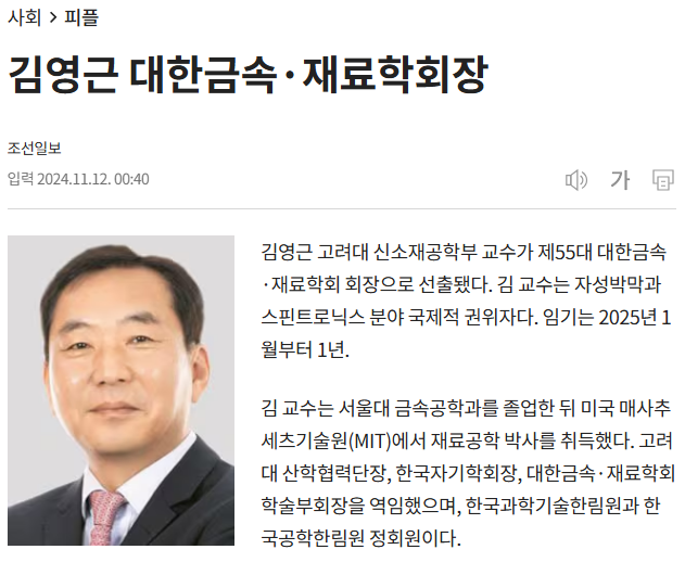 출처: "김영근 대한금속·재료학회장", 조선일보, 2024년 11월 12일, https://www.chosun.com/national/people/2024/11/12/FMXQHZ4LCZHXPBWYQBBREKLUW4/