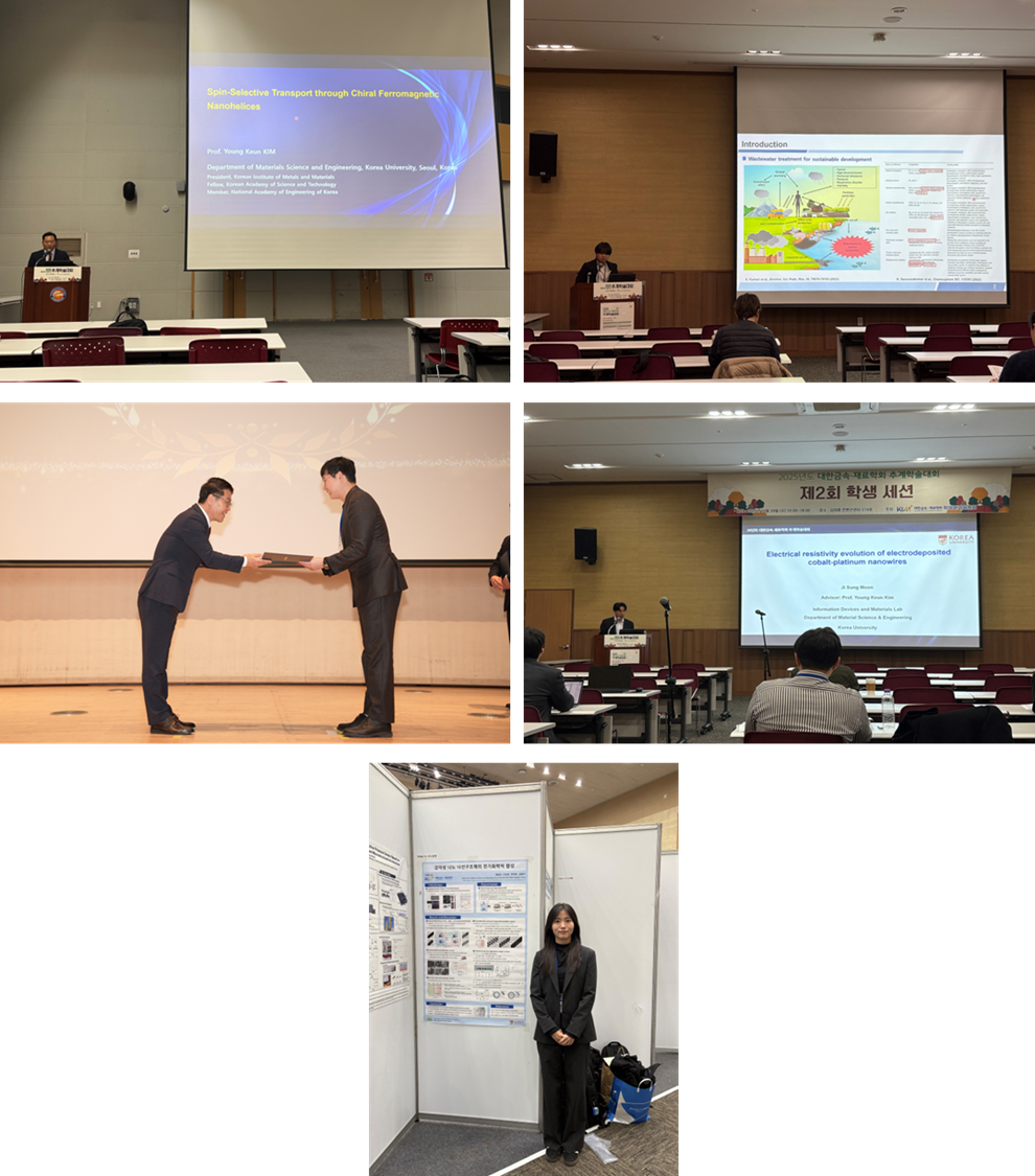 Graduate student Mr. Hong-Eun Fu, Ms. Eun-Jin Jeong, Mr. Tae-Yoon Lee, and Mr. Ji-Sung Moon attended the Fall Conference of the Korean Institute of Metals and Materials, held at the Kim Daejung Convention Center in Gwangju from October 29 to 31, 2025. Invited speaker Professor Young-Keun Kim gave a presentation in the Nano-Convergence Special Session on the topic "Spin-selective transport through chiral ferromagnetic nanohelices."