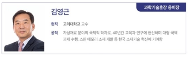 2026년 과학정보통신의 날 기념식에서 고려대학교 김영근 교수가 과학기술훈장(웅비장)을 수훈하였음. 과학기술훈장은 과학기술 발전에 이바지한 인물에게 수여되는 훈장이며, 김영근 교수는 자성재료 분야의 국제적 학자로서 40년간 교육과 연구에 헌신하며 대형 국책 과제 수행, 스핀 메모리 소재 개발 등 대한민국의 소재 기술 혁신에 기여한 공로를 인정받아 이번 훈장을 수훈함.