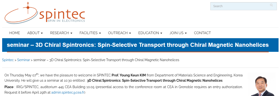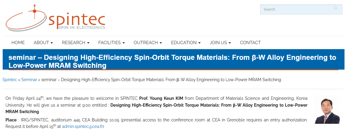 Professor Young Keun Kim delivered two invited talks as a speaker at Spintec, a world-renowned research institute in France, on April 24th and May 7th. The titles of the lectures are as follows.