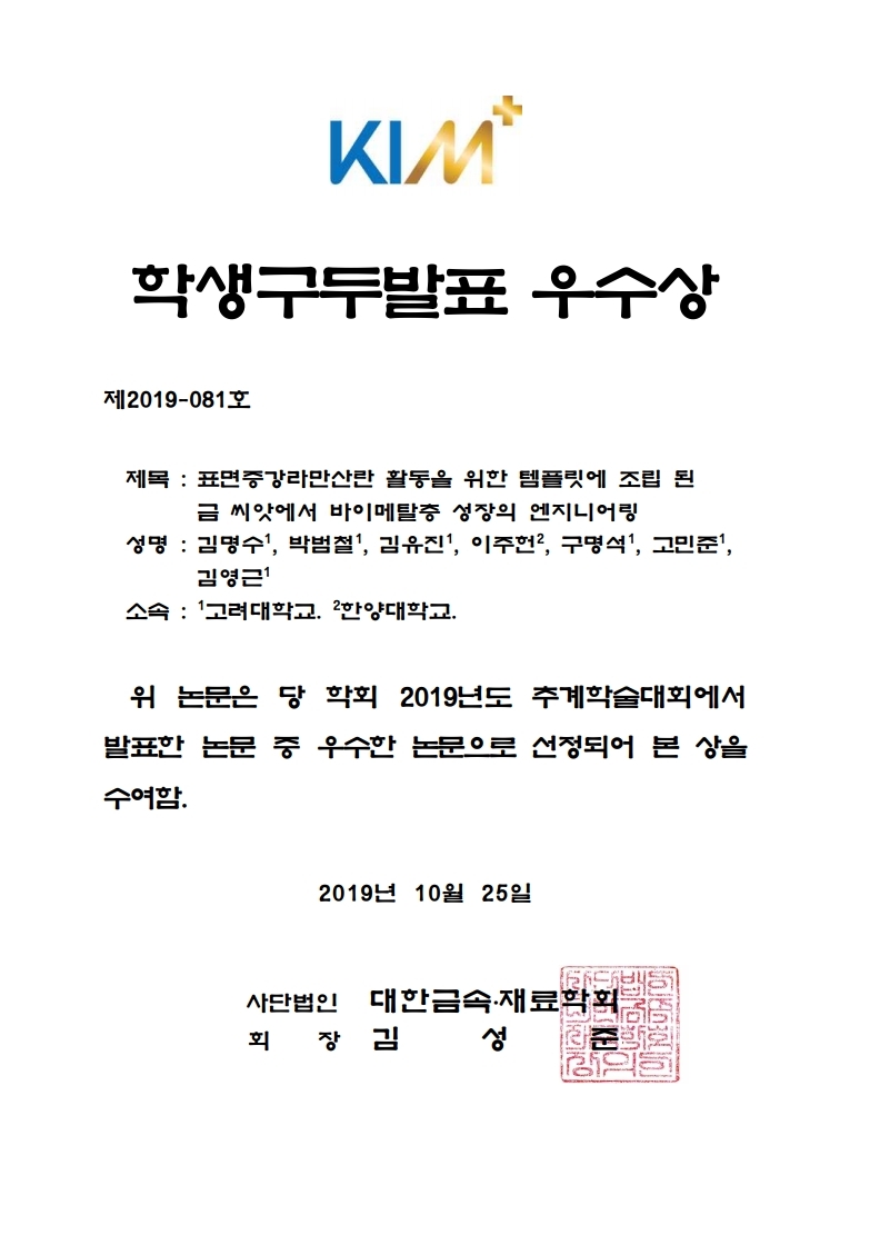 - 김명수 (Oral): Engineering of bimetallic layer growth from gold seed assembled on magnetite template for surface-enhanced Raman scattering activity