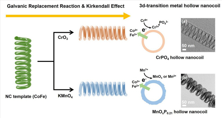 The fabrication of 3D hollow nanostructures not only allows the tactical provision of specific physicochemical properties but also broadens the application scope of such materials in various fields. The synthesis of 3D hollow nanocoils (HNCs), however, is limited by the lack of an appropriate template or synthesis method, thereby restricting the wide-scale application of HNCs. Herein, a strategy for preparing HNCs by harnessing a single sacrificial template to modulate the interfacial reaction at a solid–liquid interface that allows the shape-regulated transition is studied. Furthermore, the triggering of the Kirkendall effect in 3D HNCs is demonstrated. Depending on the final state of the transition metal ions reduced during the electrochemical preparation of HNCs, the surface states of the binding anions and the composition of the HNCs can be tuned. In a single-component CrPO4 HNC with a clean surface, the Kirkendall effect of the coil shape is analyzed at various points throughout the reaction. The rough-surface multicomponent MnOxP0.21 HNCs are complexed with ligand-modified BF4-Mn3O4 nanoparticles. The fabricated nanocomposite exhibits an overpotential decrease of 25 mV at neutral pH compared to pure BF4-Mn3O4 nanoparticles because of the increased active surface area.