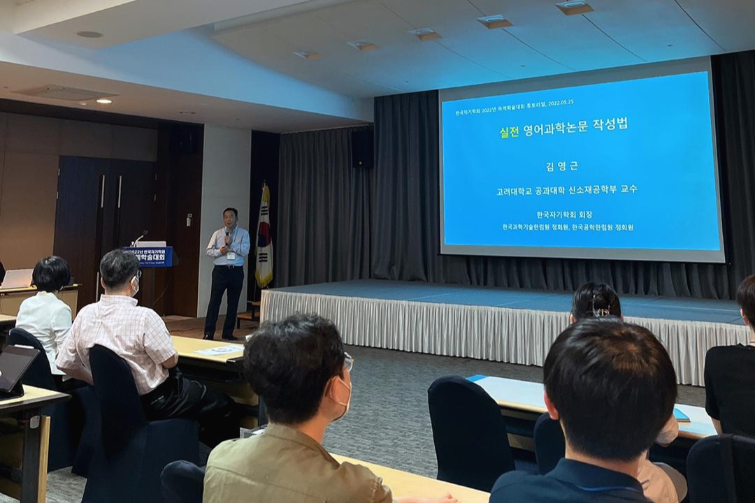 대학원생 이정규, 고한석, 부홍은, 이지영, 정은진이 2022년 5월 25일부터 27일 제주도에서 개최된 한국자기학회 하계학술대회에 참석했다. 한국자기학회장인 김영근 교수는 tutorial session에서 실전 영어과학논문 작성법을 강연했다.