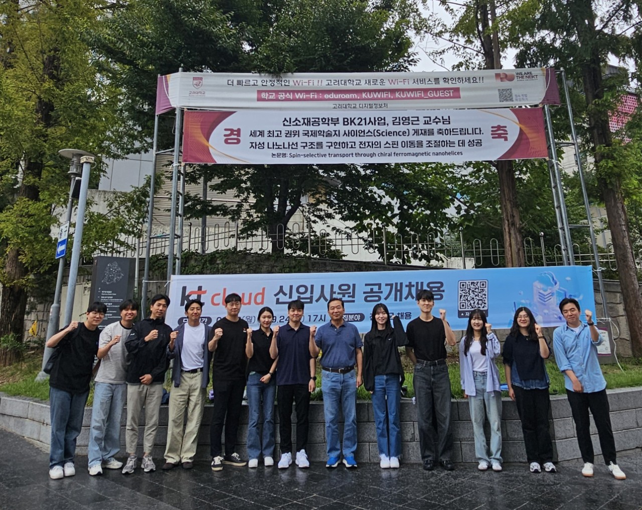 고려대학교 김영근 교수 연구팀은 자성 나노나선 구조를 구현하고 전자의 스핀 이동을 조절하는 데에 성공하여 세계 최고 권위 국제 학술지인 사이언스(Science)에 게재를 하는 쾌거를 이루었다. 아래는 고려대학교 김영근 교수 연구팀의 사진이다.